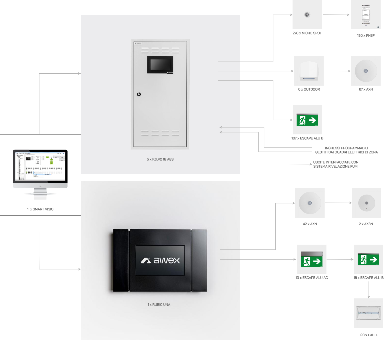 Il software grafico SMART VISIO collegato in rete completa il progetto, consentendo di avere un’unica postazione di monitoraggio e gestione di tutti i sistemi.